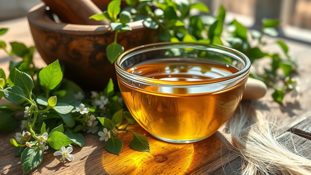 Finally, consider castor oil, rich in ricinoleic acid, which can enhance hair growth and thickness. By combining these ingredients, you create a potent remedy that not only connects you to ancient wisdom but also fosters a sense of community among those striving for luscious locks.