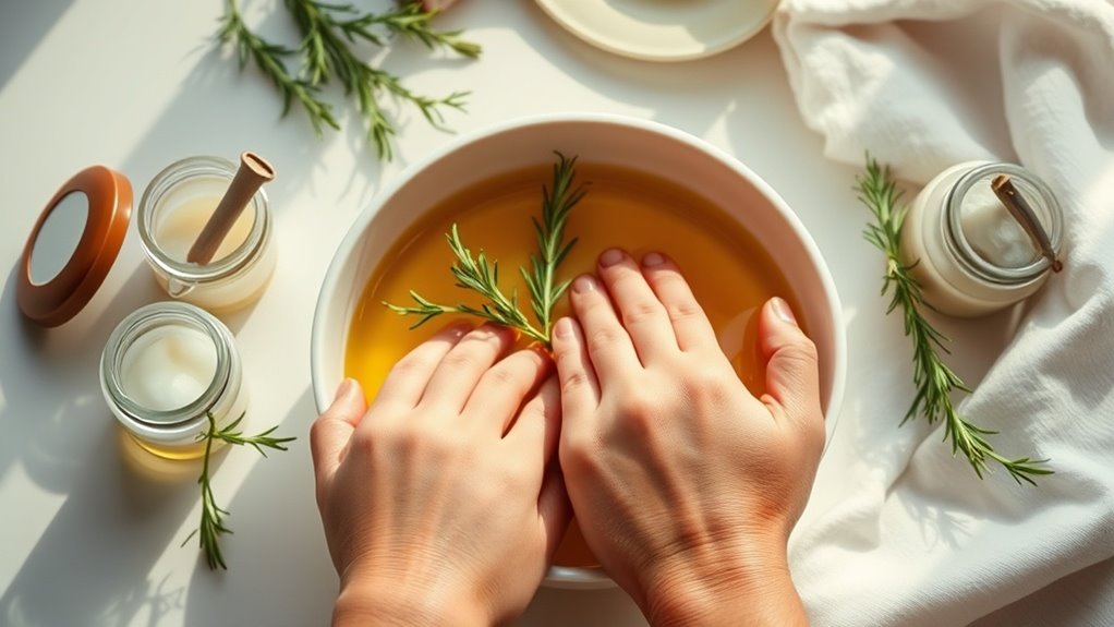 To relieve hand pain and dryness, start by identifying possible causes, such as typing or environmental factors. Use natural moisturizers like coconut oil or shea butter daily to hydrate your skin. Incorporate finger stretches and grip-strengthening exercises to boost flexibility and reduce discomfort. Consider dietary changes, like adding omega-3 fatty acids and antioxidants, for overall hand health. If pain persists or worsens, consult a professional for guidance. For more effective strategies, continue exploring your options.