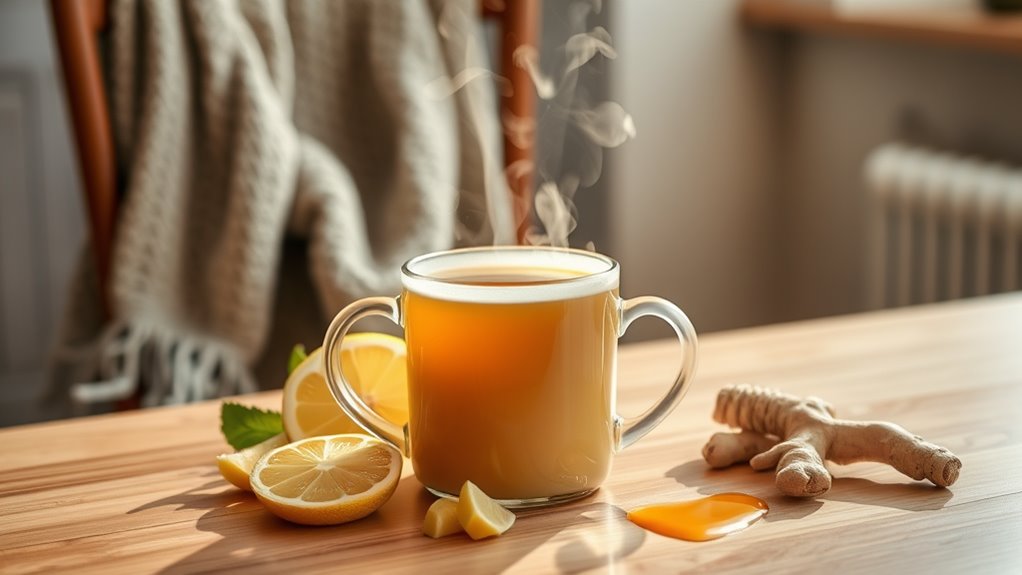 Next, sip on warm herbal tea with honey—it’s soothing and adds moisture. Honey provides natural antimicrobial properties that can help coat the throat. Ancient remedies often combine honey with healing herbs like thyme for extra relief.
