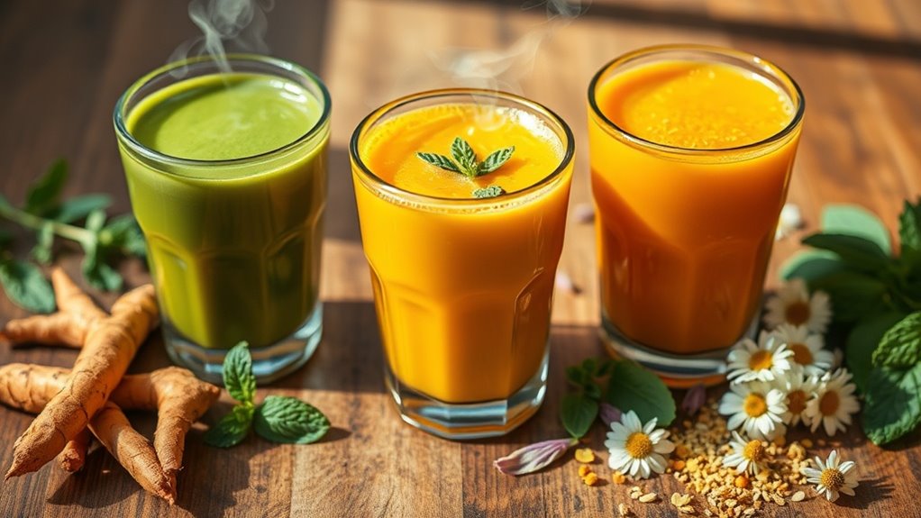 To soothe intestinal inflammation, consider incorporating herbal drinks like chamomile tea, peppermint infusion, and ginger brew into your routine. Chamomile calms the digestive system, while peppermint relaxes muscles and aids digestion. Ginger is a powerful anti-inflammatory that promotes gut wellness. Turmeric lattes offer healing benefits with curcumin, and both licorice root tonic and aloe vera juice support intestinal health and hydration. To discover more options for digestive relief, continue exploring these beneficial remedies.