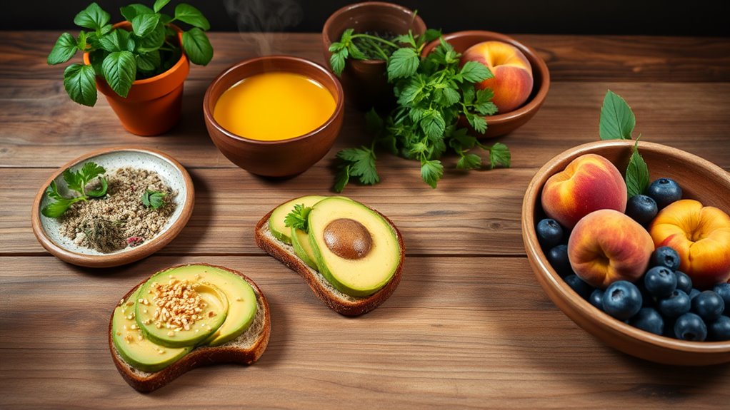 To calm your gut, incorporate probiotic-rich yogurt for beneficial bacteria and soothing bone broth for repairing gut lining. Fiber-packed fruits and vegetables, like berries and leafy greens, regulate bowel movements and feed good gut bacteria. Fermented foods, such as sauerkraut and kimchi, enhance digestion, while gentle whole grains provide essential soluble fiber. Together, these foods reduce inflammation and improve gut function. Discover how to optimize your diet for even better gut health.