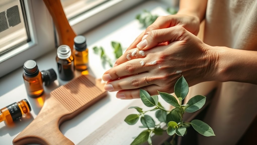 Natural oils offer a simple, effective way to ease hand pain and inflammation, drawing on centuries of traditional use backed by modern research. You’ll find that applying oils like lavender or eucalyptus directly to your hands can reduce discomfort quickly. Research from the Journal of Ethnopharmacology supports their anti-inflammatory effects, making them ideal for your morning routine. To enhance the treatment, try incorporating exfoliation techniques with natural abrasives for better skin renewal.