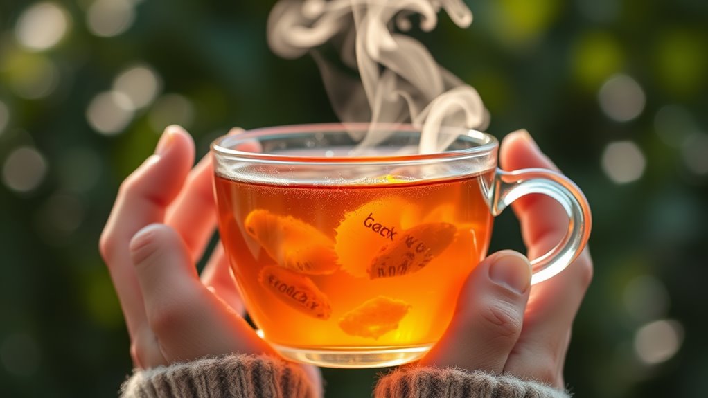 Research supports the use of tea as a natural remedy for soothing sore throats. Studies show that herbal teas like chamomile and ginger contain anti-inflammatory properties, while honey and lemon add extra soothing effects. Drinking warm tea increases blood flow to your throat, helping it heal faster. Some studies even suggest that the steam from hot tea can reduce throat irritation. Additionally, the use of honey and herb throat applications has been practiced since ancient times for their healing properties. Plus, you’re part of a community that values natural healing methods. Ginger relaxes muscles that cause coughing, making it a beneficial addition to your tea. So, grab your favorite mug, steep some tea, and embrace this comforting ritual. Honey and lemon create a natural antibiotic and anti-inflammatory solution that enhances the effectiveness of your tea. You’re not alone in this journey toward wellness—many are finding relief through the simple power of tea.